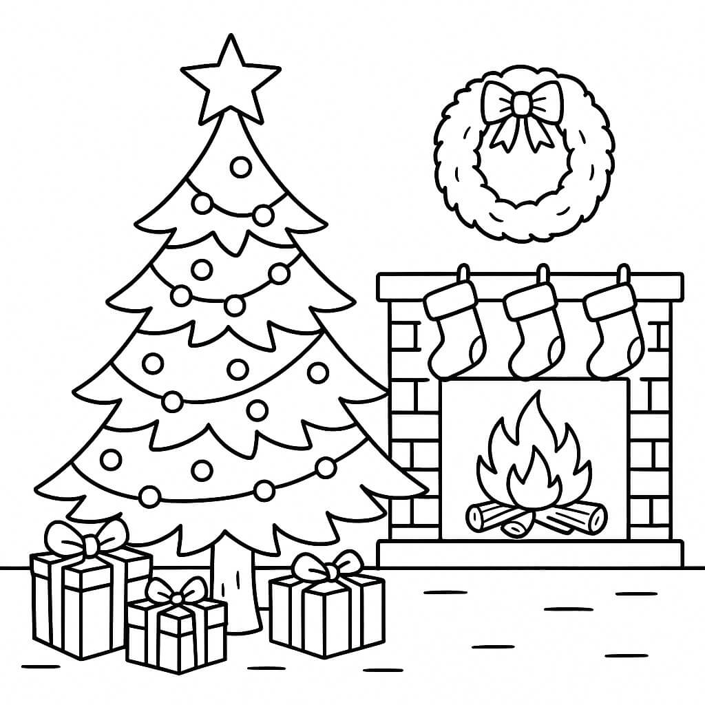 Árvore de Natal e lareira para colorir