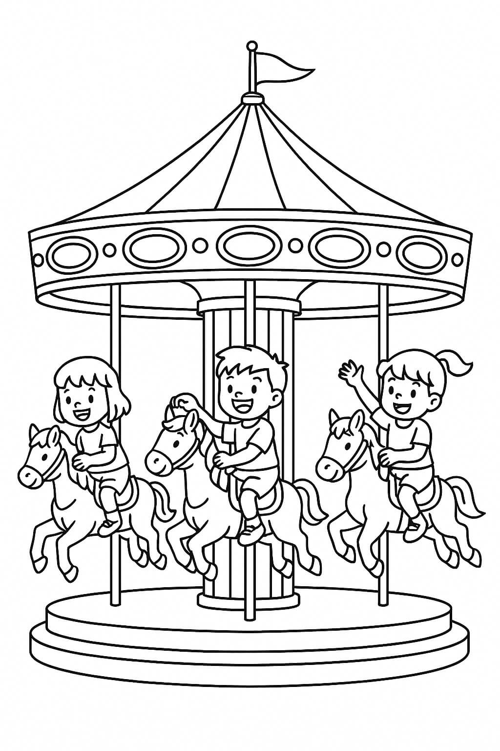 Crianças se divertindo em um carrossel animado, ideal para colorir em família.