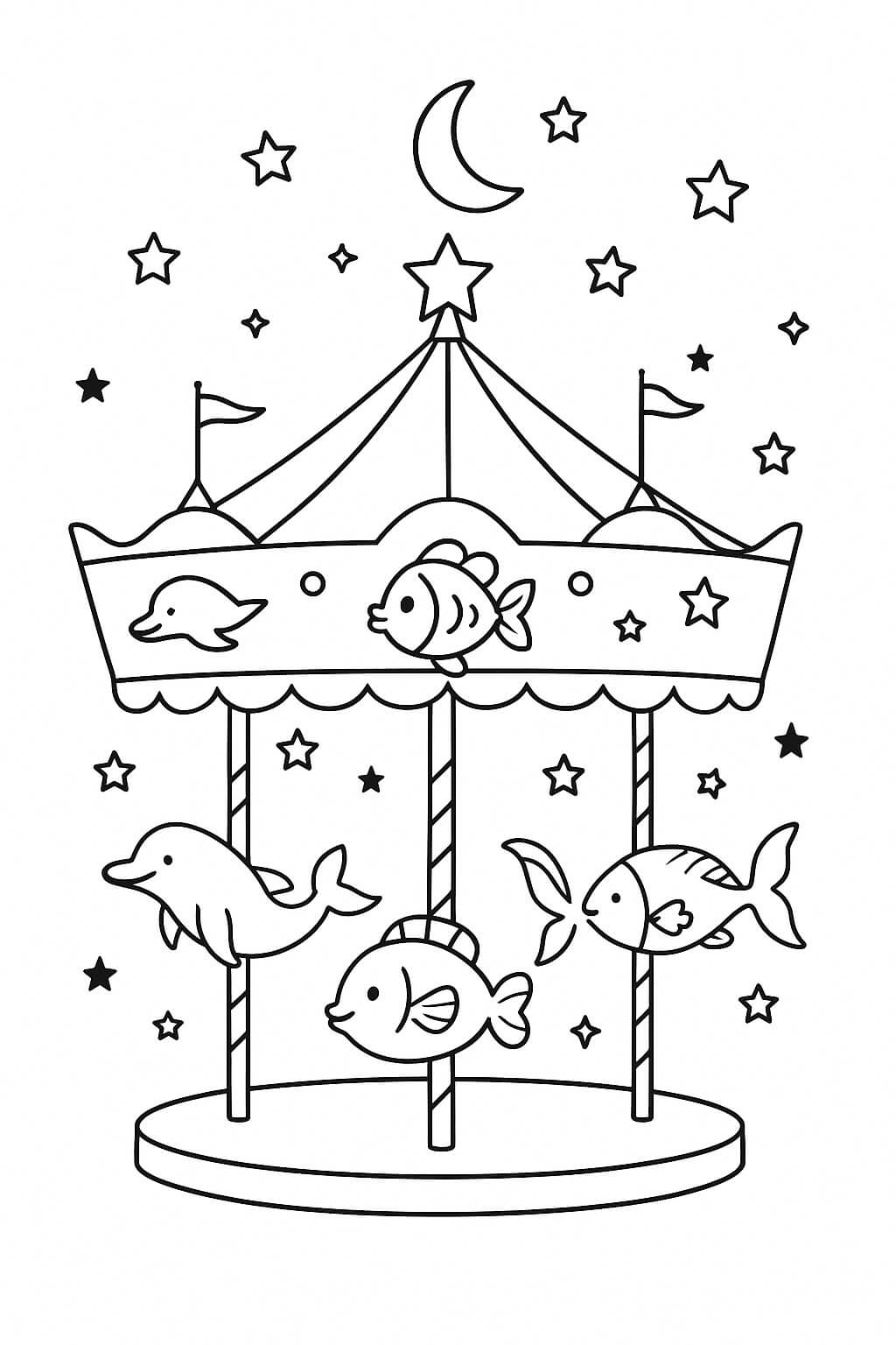 Carrossel mágico com estrelas e a lua ao redor, perfeito para pinturas noturnas.