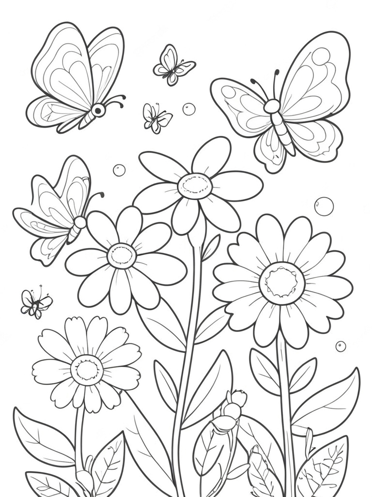 Nesta cena encantadora, flores e borboletas se encontram. Use cores vibrantes para as borboletas e torne este cenário ainda mais mágico!