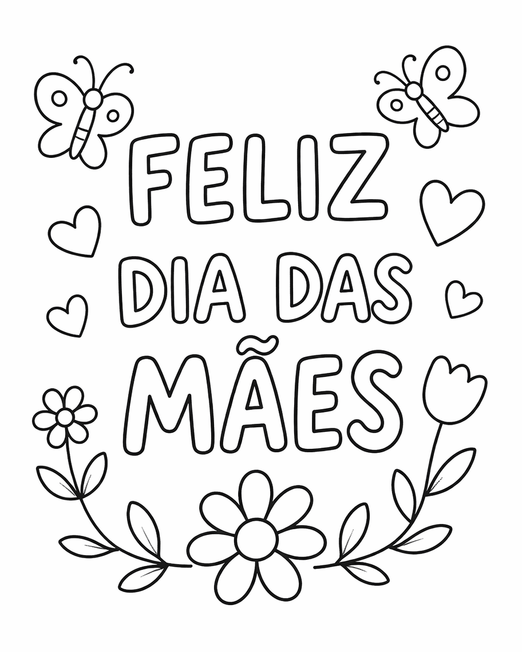 Desenho com a frase Feliz Dia das Mães, ideal para imprimir, colorir e entregar como lembrança nessa data tão especial.