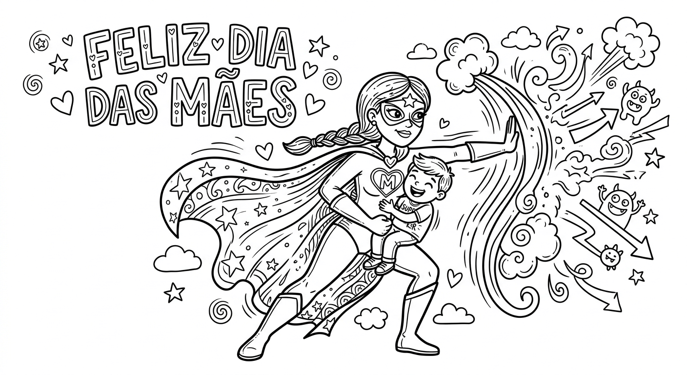 Uma mãe heroína em homenagem ao Dia das Mães, ideal para mostrar de forma criativa como as mães são verdadeiras super-heroínas.