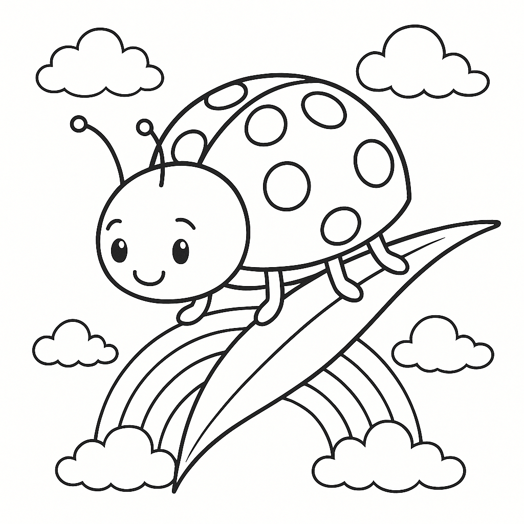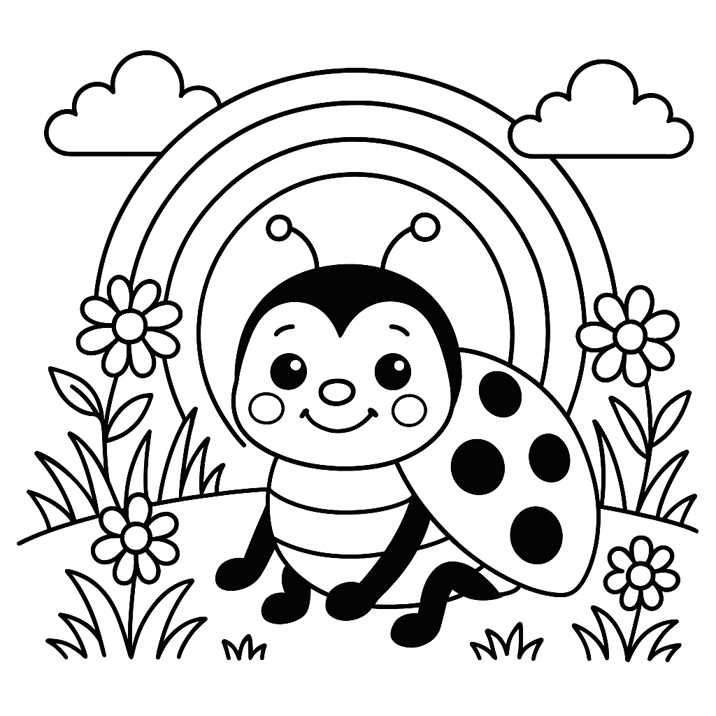 Joaninha sob um arco-íris, um toque mágico para colorir com muitas cores.