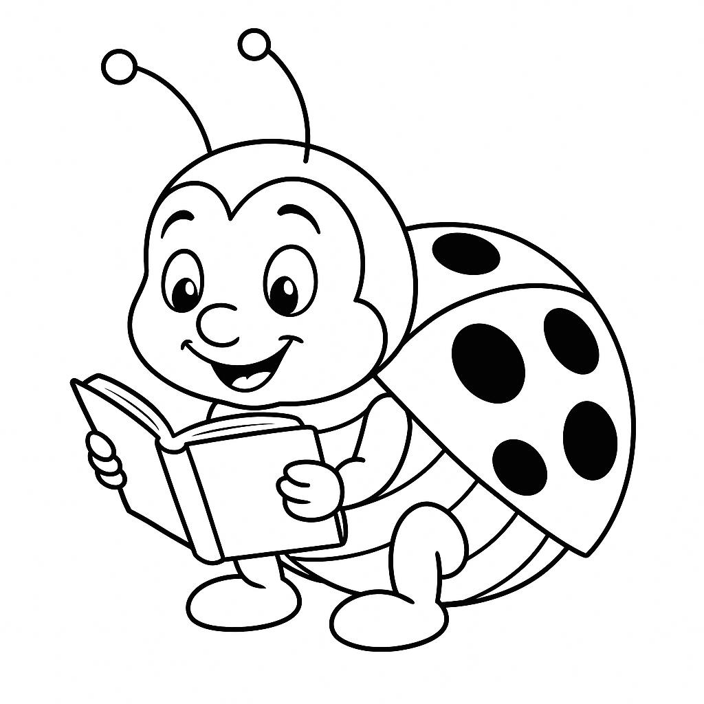 Uma joaninha studiosa lendo um livro, ideal para atividades educativas.