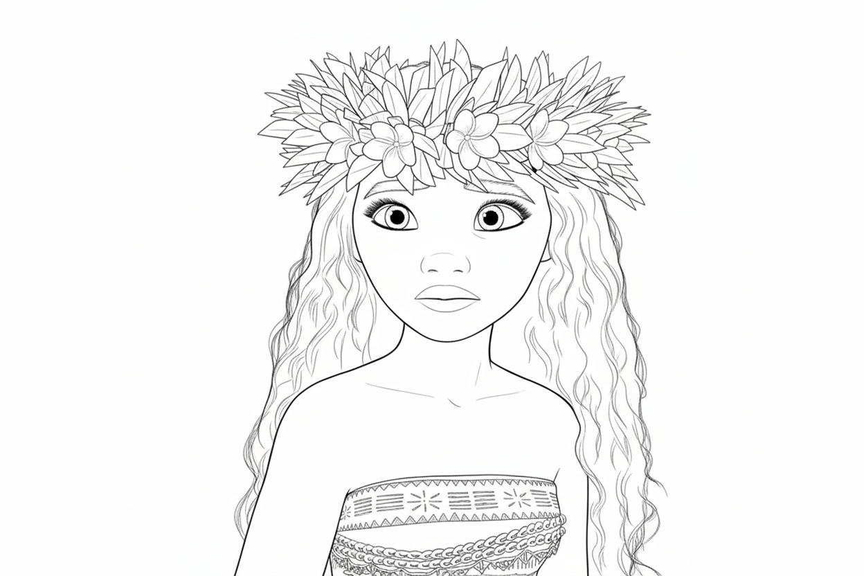 Moana com uma linda coroa das ilhas. Pinte com dourado, azul e verde oceano!