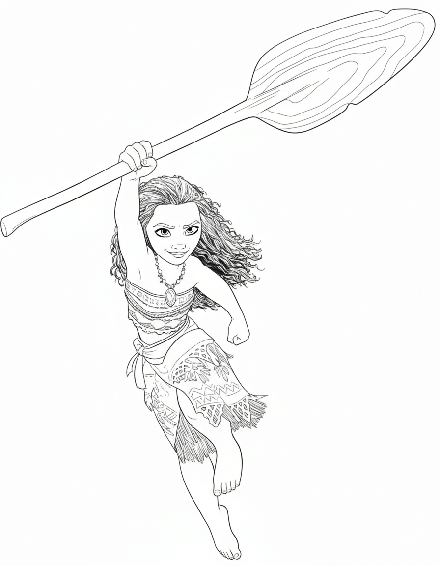 Moana segura seu remo mágico que guia suas aventuras pelos oceanos.