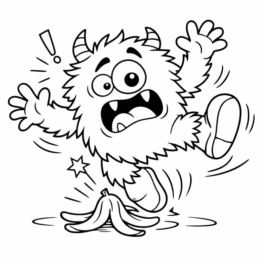 Cena engraçada: o monstro escorregou na banana! Perfeito para fazer uma pintura bem colorida e divertida.