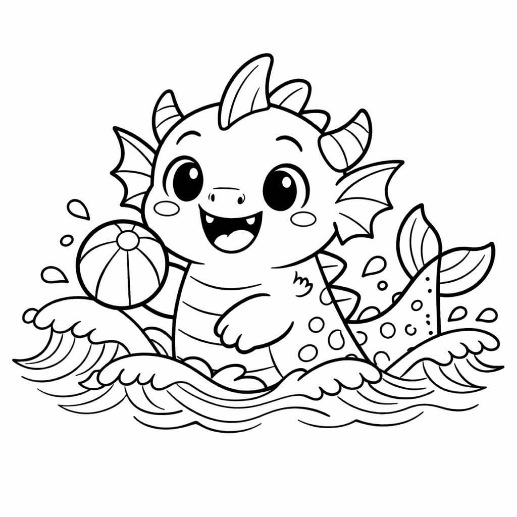Um monstro brincando na praia construindo um castelo de areia. Pinte a areia em bege e o mar bem azul!