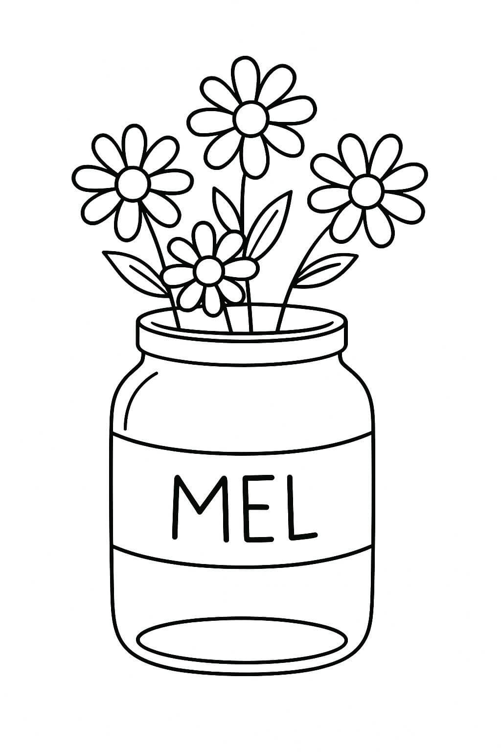 Pote com a palavra “MEL”, coberto de mel escorrendo e com duas abelhas curiosas.