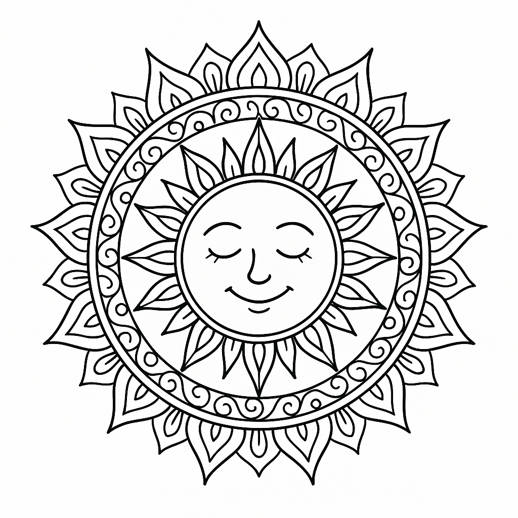Mandala detalhada com motivo solar, ideal para relaxar enquanto pinta.