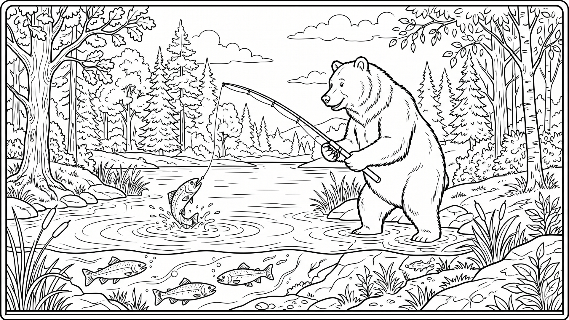 Um desenho detalhado de urso em ambiente natural.